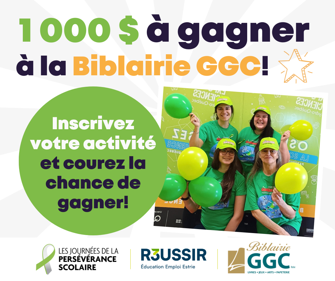 💰Courez la chance de gagner 1 000 $ à la Biblairie GGC! Chaque activité inscrite = une chance de gagner.